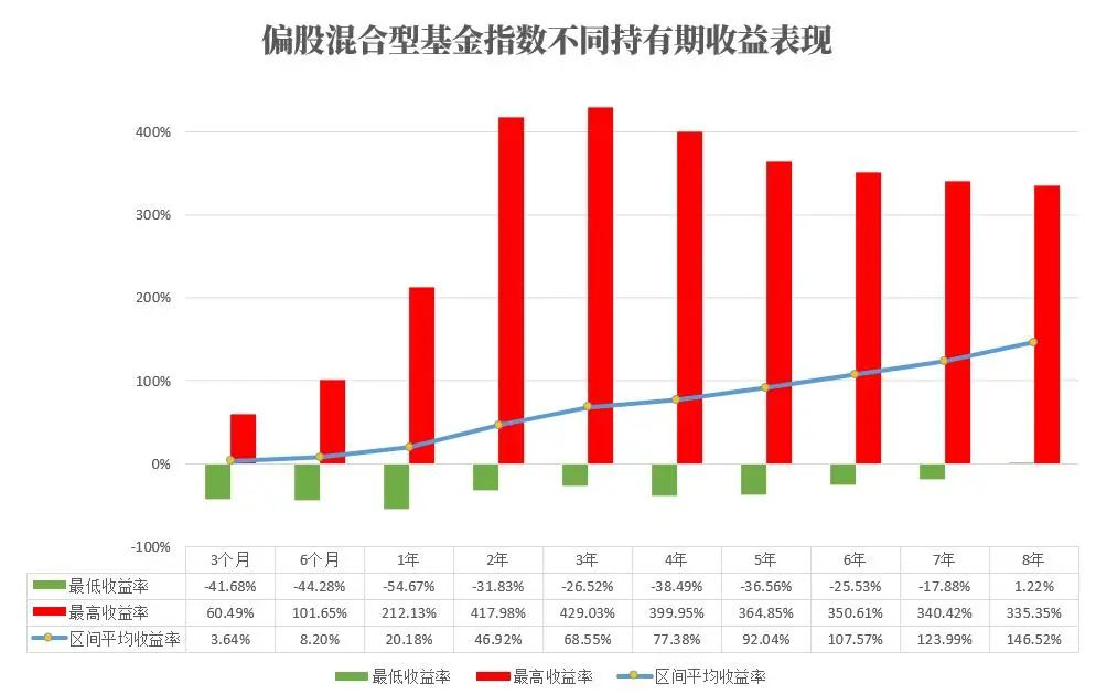 除了提升正收益的概率,我們投資基金自然也希望獲得更好的收益體驗。我們仍以偏股混合型基金指數(shù)(Wind代碼:885001.WI)為例,統(tǒng)計從指數(shù)設立開始至2022年底近20年的數(shù)據(jù),任意一天內買入該指數(shù),分別持有3個月、6個月、1年、2年、3年、5年、6年、7年、8年的平均收益率。