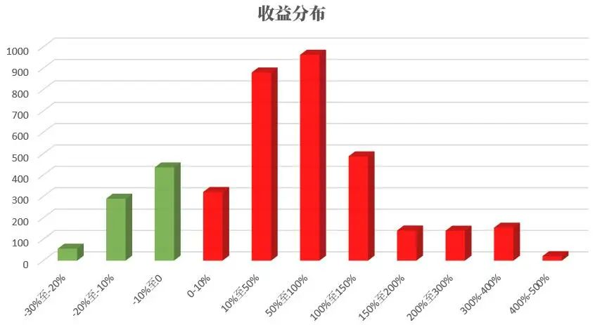 從中我們可以看到,獲得極高與極低收益次數(shù)的機會都比較少,最多的收益區(qū)間還是落在50%-100%當中,而平均收益率68.55%也在這一區(qū)間之中。其實,只要采用持有這一簡單的行為,大概率上我們會獲得一個還不錯的收益。