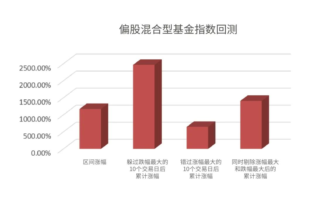 仍以偏股混合型基金指數(shù)(885001)為例,從指數(shù)2003年12月31日成立到2021年12月31日間,累計收益為1170.12%,漲了十一倍多。而如果我們能夠精準(zhǔn)躲過跌幅最大的十個交易日,那我們能夠?qū)⑹找媛试僬槐?,達(dá)到驚人的2466%!